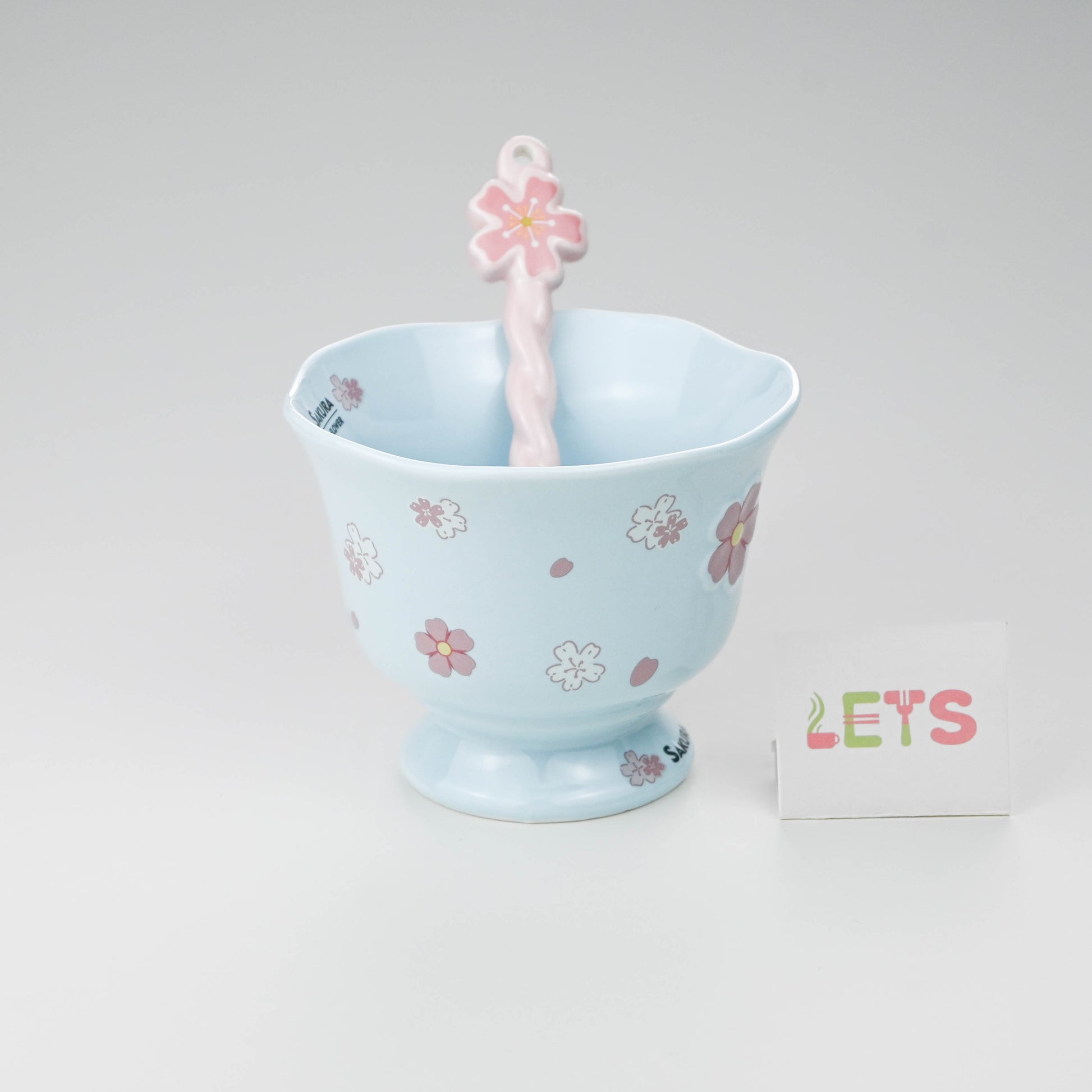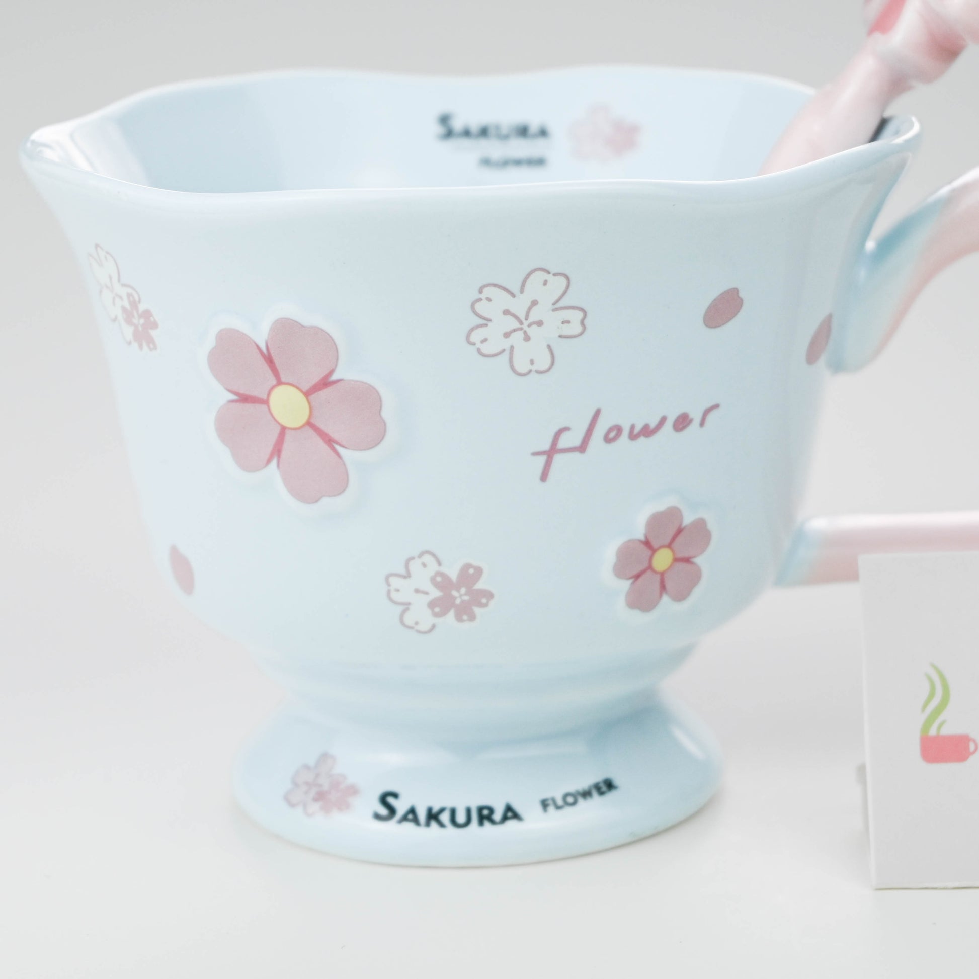 Ceramic Sakura Mug with Lid and Spoon, Pink Flower Cup - Blue & Pink
