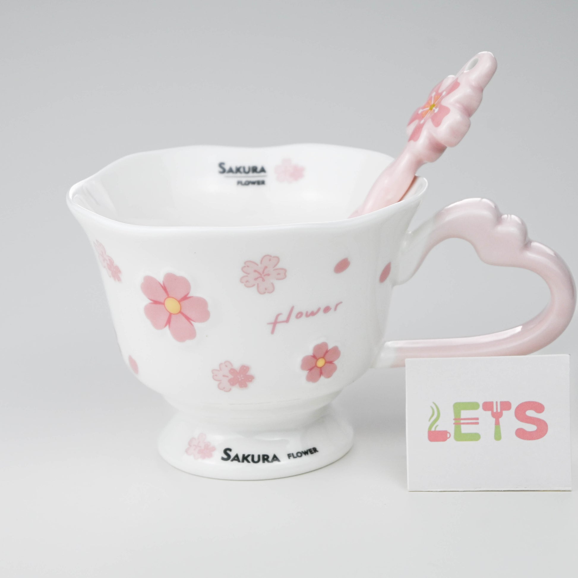 Ceramic Sakura Mug with Lid and Spoon, Pink Flower Cup - White & Pink